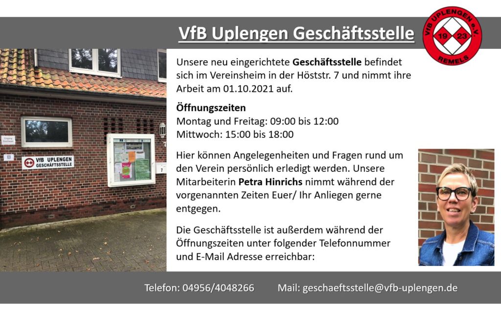 Außerhalb der Geschäftszeiten ist die Geschäftsstelle per Mail (geschaeftsstelle@vfb-uplengen.de) zu erreichen.