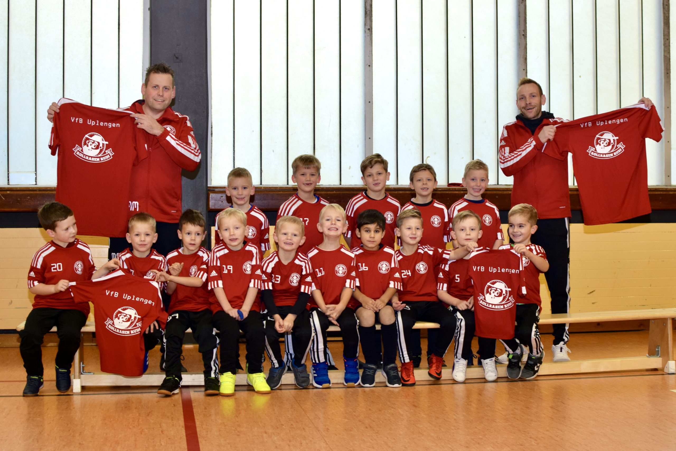 Spieler und Trainer der G-Jugend des VfB Uplengen wurden mit schicken Aufwärmshirts ausgestattet.