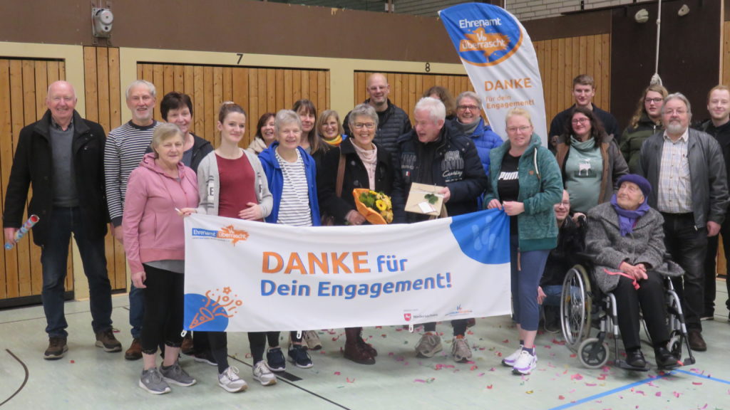Montagabend, wie jeden Montag betritt Paul Kissing die Sporthalle an der Oberschule Uplengen, um als Übungsleiter seine Sportstunde „Fit for Fun“ zu gestalten. Als er die Tür zur Halle öffnete, muss ihn so etwas wie ein „Gänsehautmoment“ überkommen haben, denn nicht nur die Damen seiner Sportgruppe, sondern auch zahlreiche Verwandte und Freunde waren dort versammelt, darunter auch die 96jährige Mutter seiner Lebensgefährtin, die zu diesem Anlass von Köln aus nach Remels anreiste. Ein Banner mit der Aufschrift „Danke für dein Engagement“ signalisierte, dass hier jemanden gedankt werden sollte, für das, was er seinem Verein gegeben hat.