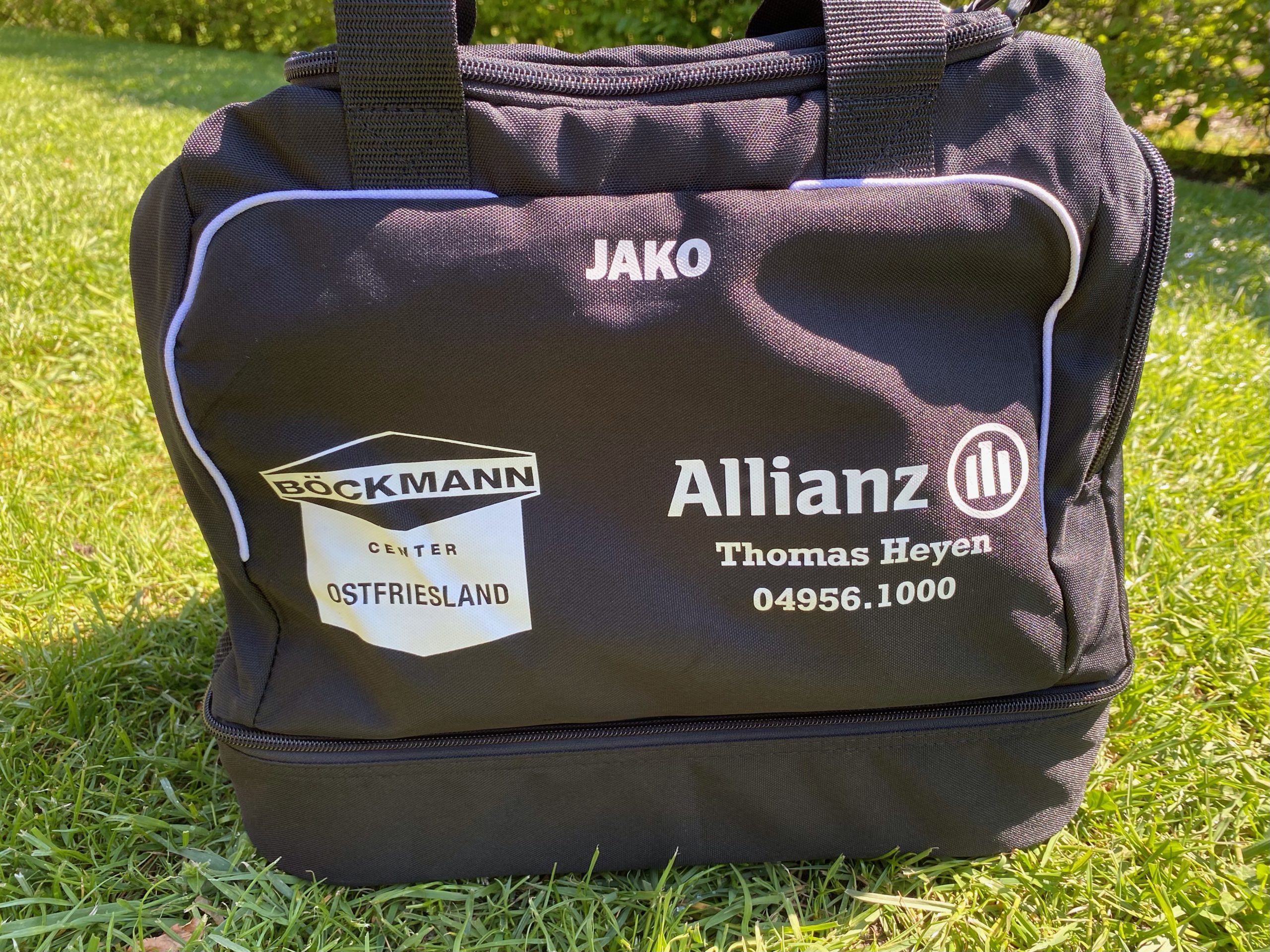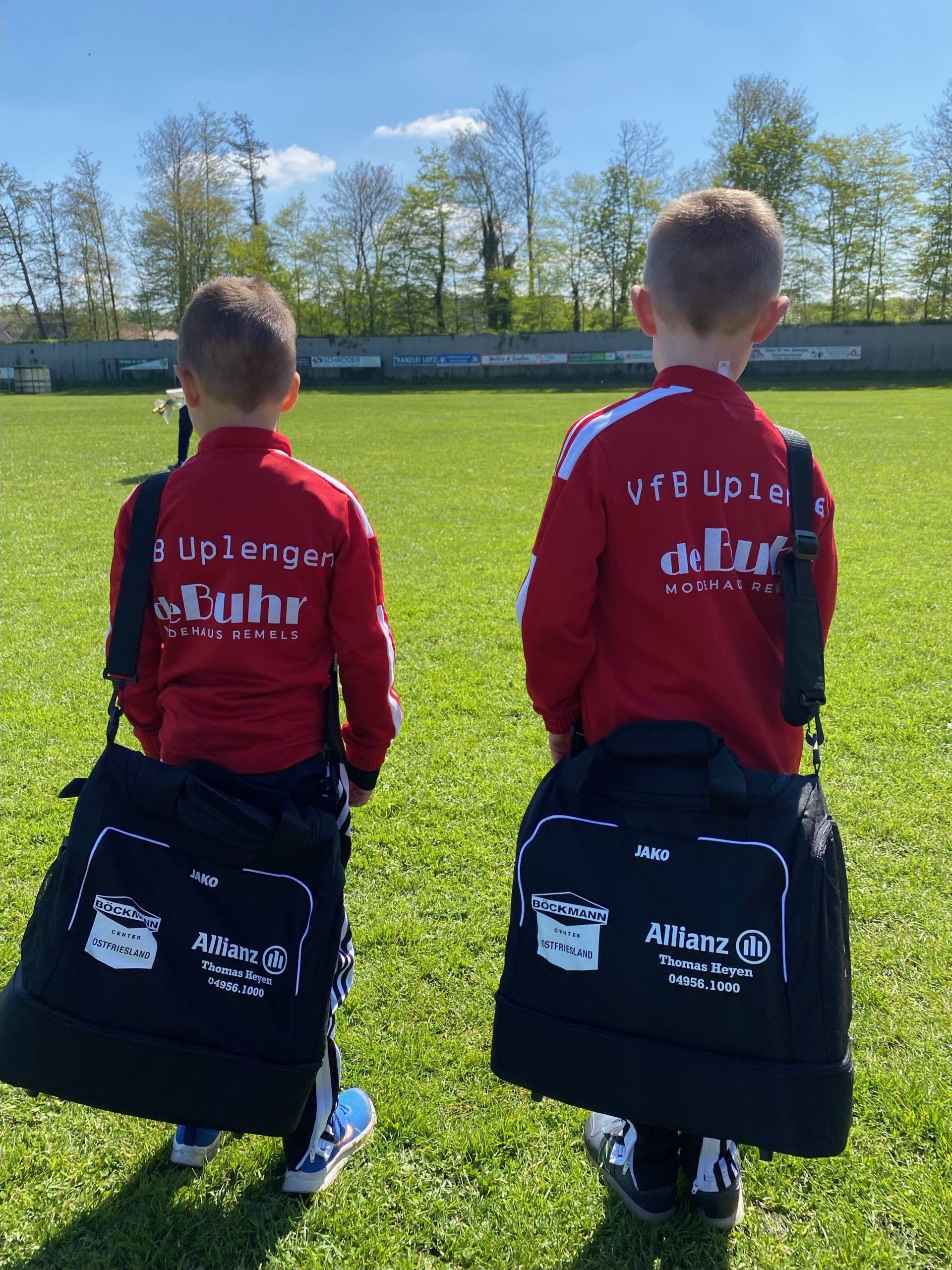 Große Augen machten die kleinsten Kicker des VfB Uplengen, als sie nach dem letzten Training von zwei Sponsoren überrascht wurden. Dennis Münk vom Böckmann Center Ostfriesland in Jübberde und Thomas Heyen von der Allianz Generalvertretung in Remels spendierten tolle Sporttaschen für die ganze Mannschaft. Perfekt ausgestattet ging es am Samstag zum Funino-Turnier in Hesel, bei dem der VfB mit vier Teams und 17 Kindern vertreten war. Kinder, Eltern und Trainer bedanken sich herzlich bei Boeckmann Center Ostfriesland und Allianz Heyen für die tolle Aktion.